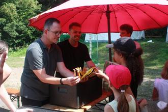 Am 1. August besuchte Bürgermeister der Gemeinde Lohfelden, Uwe Jäger, gemeinsam mit seinem Amtskollegen aus Söhrewald, Ralf Eberwein, sowie der stellvertretenden Leiterin des Fachbereichs Verwaltung und Ordnung, Tanja Hammer, und dem Kinder- und Jugendbeauftragten der Gemeinde Lohfelden, Andreas Schmid, die zahlreichen FEZ-Kinder und deren Betreuerinnen und Betreuer auf dem FEZ-Platz „Unter den Eichen“. Im Gepäck hatten sie leckeres Eis für alle.