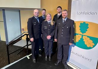 Stellvertretend für alle in der Gemeinde Lohfelden ehrenamtlich Tätigen dankte der Bürgermeister der Freiwilligen Feuerwehr Lohfelden, die die Silvesternacht im Feuerwehrhaus verbracht hatte, um sofort einsatzbereit zu sein, hier v.l.n.r. Stv. Gemeindebrandinspektor Kevin Jonson, Stv. Gemeindejugendwart David Brunkow, Gemeindejugendwartin Leonie Schweinsberg, Stv. Kinderjugendwart Pascal Frommann und Gemeindebrandinspektor Markus Orth.