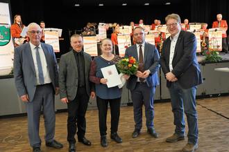 Den Ehrenbrief des Landes Hessen für über 12-jährige ehrenamtliche Tätigkeit überreichte Staatsminister Timon Gremmels (2.v.r.) an Katrin Schmidt. Gemeindevertretervorsitzender Norbert Thiele (2.v.l..) Bürgermeister Uwe Jäger (l.) und Kreisbeigeordneter Thomas Ackermann (r.) gratulierten herzlich.