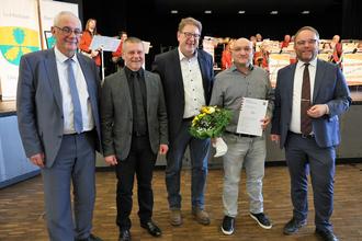 Den Ehrenbrief des Landes Hessen für über 12-jährige ehrenamtliche Tätigkeit erhielt Megdi Tafoski (2.v.r.) von Staatsminister Timon Gremmels (r.). Gemeindevertretervorsitzender Norbert Thiele (2.v.l.), Bürgermeister Uwe Jäger (l.) und Kreisbeigeordneter Thomas Ackermann (M.) gratulierten herzlich.