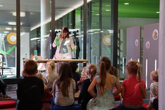 Das erste Highlight gab es bereits bei der Begrüßung: Dash, der Bücherei-Roboter, hieß die Kinder willkommen und begleitete sie zur ersten Station. Hier lernten sie Henri, den Bücherdieb kennen. Anschließend ging es mit einem spannenden Experiment weiter. Die jungen Besucherinnen und Besucher lernten, wie man mit Essig und Backpulver einen Luftballon aufblasen kann, ohne selbst pusten zu müssen.