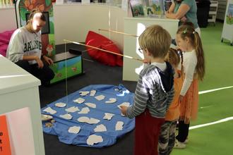 Eine Bücherei ist vor allem für eines bekannt: Bücher. Beim Angel-Spiel fischten die Mädchen und Jungen nach verschiedenen Figuren, die aus ihren Bilderbüchern ausgebüxt sind und wieder eingefangen und zugeordnet werden mussten. Natürlich durfte auch die Ausleihe nicht fehlen – das Kerngeschäft der Bücherei. Die Kinder verbuchten selbst Medien und wenn der PC „Piep“ machte, wussten sie, dass die Ausleihe erfolgreich war.