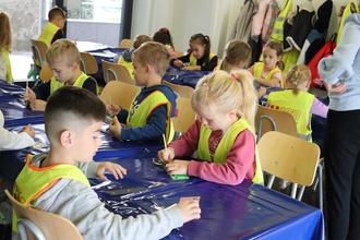 Die Mädchen und Jungen verzieren ihre Lesezeichen.