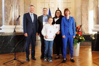 Gemeinsam mit Staatssekretär Martin Rößler (l.) übergab Integrationsministerin Heike Hofmann (r.) die Einbürgerungsurkunden im Biebricher Schloss unter anderen an die ursprünglich aus der Republik Moldau stammende Lohfeldener Familie Rau (v.l.n.r.): Vater Andrei Rau, Sohn Platon Rau und Ehefrau Natalia Rau. Nicht auf dem Foto zu sehen ist der ältere Sohn, Andrei Rau, der bei dem offiziellen Übergabetermin verhindert war und die Einbürgerungsurkunde zu einem späteren Zeitpunkt im Rathaus Lohfelden erhält.
