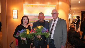 Bürgermeister Uwe Jäger (r.) bedankte sich beim Künstler Zaki al Maboren (M.) für die Ausstellung seiner Werke im Rathaus. Sonja Rossettini (l.) stellte Künstler im Rahmen eines Interviews vor.