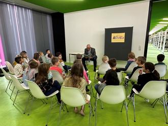 Bürgermeister Uwe Jäger las aus dem Buch „Grimm und Möhrchen“ von Stephanie Schneider und Stefanie Scharnberg vor. Die Kinder hörten gespannt zu, was der Buchhändler Grimm und der kleine Esel Möhrchen erleben. Insbesondere Möhrchens Vorliebe für ungewöhnliche Dinge und Wörter sorgte für Lacher bei den Kindern.