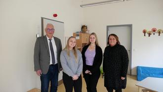 Bürgermeister Uwe Jäger besuchte die beiden angehenden Erzieherinnen Alisa Sußebach (2.v.l.) und Laura Pristl (3.v.l.) sowie Leiterin der KiTa Vollmarshausen, Claudia Hesse, am 16.11. an ihrem Arbeitsplatz.