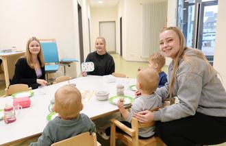Die angehenden Erzieherinnen Laura Pristl (l.) und Alisa Sußebach (r.) sowie die staatlich anerkannte Erzieherin und Praxisanleitung Lea Martens beim gemeinsamen Frühstück mit den Krippenkindern.
