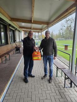 Übergabe des Defibrillators für das Sportplatzgelände Vollmarshausen am 8. November von Bürgermeister Uwe Jäger (l.) an das Vorstandsmitglied der FSK Vollmarshausen, Abteilung Fußball, Carsten Hollstein.