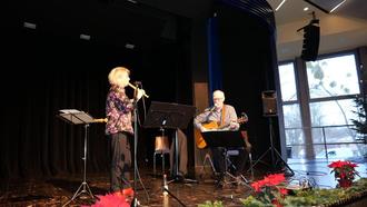 Für die musikalische Umrahmung des Nachmittages sorgte das Duo Frank Sommerfeld und Christiane Winning. Sie unterhielten die Gäste mit weihnachtlichen Liedern zum Mitsingen. Dazu spielten sie Gitarre und Flöte und ließen immer mal wieder kurze Gedichte und Geschichten einfließen. So kam im weihnachtlich dekorierten Saal bei Kaffee und Kuchen sofort gute Stimmung auf.