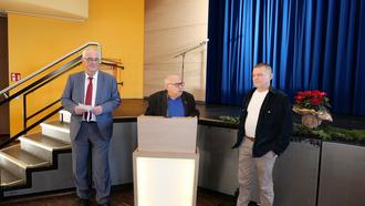 Die drei Hauptakteure des Nachmittags im vollen Bürgerhaus.