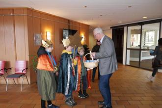Bürgermeister Uwe Jäger überreichte ein Präsent an jeden Sternsinger und übergab somit symbolisch die bereits im Vorfeld überwiesene Geldspende.