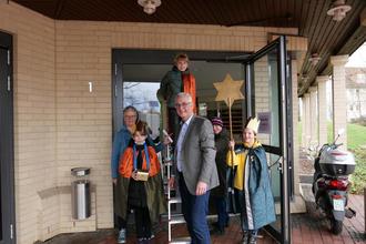 Gut gesichert von Bürgermeister Uwe Jäger (M.), Sandra Gemke (l.) und Nicola Eckhardt (r.) brachte Sternsinger Hannes Wollenhaupt den Segen für 2023 über der Eingangstür des Rathauses an.