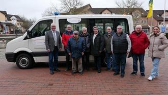 Die ehrenamtlichen Fahrer des Senioren-Einkaufsbusses (v.l.n.r.): Jörg Seeger, der kürzlich aus dem Fahrdienst ausgeschiedene, langjährige Fahrer Hans-Hermann Becker, Klaus Stephan, Markus Reubert, Hilmar Bärthel und Horst Bertram gemeinsam mit Bürgermeister Uwe Jäger (l.), Vorsitzendem des Seniorenbeirates, Karl Schäffer (3.v.l.) und Seniorenbeauftragter Katharina Schaub am 06.02. auf dem Rathausvorplatz. Nicht auf dem Foto zu sehen ist der ehrenamtliche Fahrer Thomas Imgrund.