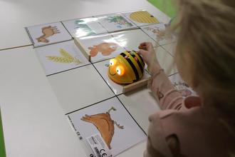 Zuerst konnten die Kinder ausprobieren, was passiert, wenn sie eine Taste drücken, also einen Befehl geben und diesen ausführen. Anschließend verfeinerten die kleinen Entdeckerinnen und Entdecker mit ein paar Spielen ihre Programmierfähigkeiten. Es wurden Blumen angesteuert, Pizzen belegt und Tiere gefüttert.