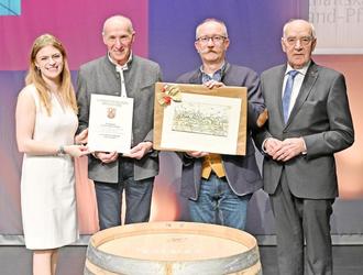Mörzheim/Neustadt. „Münze drauf – Qualität drin“: Einmal im Jahr prämiert die Landwirtschaftskammer Rheinland-Pfalz die besten Weine und Sekte sowie Edelbrände aus den verschiedenen Anbaugebieten des Landes. Bei der Prämierungsfeier der Pfälzer Betriebe im Saalbau in Neustadt an der Weinstraße wurde jetzt mit der Brennerei Horst Silbernagel aus Mörzheim auch ein Erzeuger aus Landau ausgezeichnet. Beigeordneter Jochen Silbernagel überreichte den Ehrenpreis der Stadt Landau in der Pfalz gemeinsam mit der Pfälzischen Weinkönigin Charlotte Weihl und Kammerpräsident Ökonomierat Norbert Schindler.
