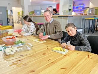 Landau. Wer mitessen will, muss auch Hand anlegen: So lautet die Devise im Jugendtreff Horst. Die gemeinsame Mahlzeit und das vorherige gemeinsame Kochen ist ein Highlight im Wochenkalender der Freizeitstätte für Kinder und Jugendliche ab 7 Jahren in Landau. Bürgermeister Dr. Maximilian Ingenthron hat in der Einrichtung der städtischen Jugendförderung am Danziger Platz jetzt vorbeigeschaut, mit den Kids fleiÃig Gemüse geschnippelt und sie vor dem Essen noch zu einer Runde Tischkicker herausgefordert.