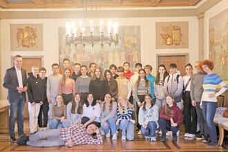 Bürgermeister Maximilian Ingenthron (links) hat Schüler:innen des ESG mit ihren Austauschpartner:innen aus dem spanischen Lugo im Landauer Rathaus begrüßt.