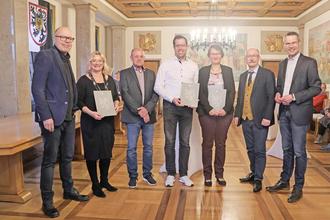 Oberbürgermeister Dominik Geißler (links), Bürgermeister Maximilian Ingenthron (rechts) und Beigeordneter Jochen Silbernagel (2.v.r.) mit den geehrten Annette Krohmer, Gerhard Neumann, Simon Nichterlein und Kerstin Baudisch (v.l.n.r.).