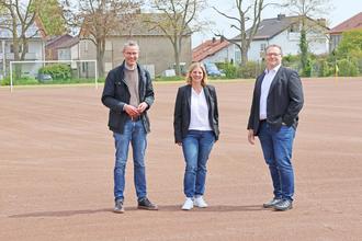 Freuen sich über den sanierten Sportplatz in Nußdorf (v.l.n.r.): Bürgermeister Dr. Maximilian Ingenthron, die Leiterin der Grundschule in Nußdorf Ute Metz und Ortsvorsteher Dr. Thorsten Sögding.