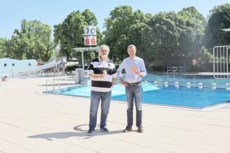 Bürgermeister Dr. Maximilian Ingenthron (rechts) und Stadtjugendpfleger Arno Schönhöfer mit LandauPass und Ferienkarte im Freibad am Prießnitzweg.