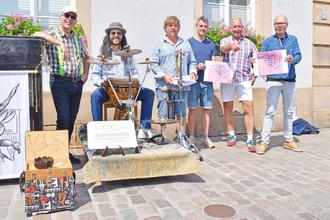 Freuen sich auf die Fête de la musique in Landau: Die FuZo- Groovers Matthias Müller und Jeffrey Deubler (v.l.n.r.), Armin Schowalter, Marcel Fritsch, Inhaber des Cafés Mago und der Bengels Bar, Henry Bartsch, Inhaber der Hexestub und Dominik Geißler.