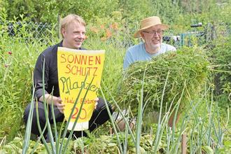 Mulchen macht den Unterschied: Lukas Hartmann (links) zu Besuch im Klimagarten von Oliver Decken.