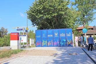 Der umgestaltete Vorplatz mit Parkplätzen und Fahrradabstellmöglichkeiten schließt sich nahtlos an den barrierefreien Bahnsteig an. Die blauen VRN-Radboxen können digital gebucht werden.