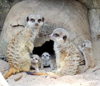 Erdmännchen sind sehr gesellige Tiere, die in ihrer Heimat, in Familiengruppen von bis zu 30 Tieren leben. Jeweils nur ein dominantes Weibchen paart sich. Die anderen Weibchen der Gruppe und männliche Verwandte helfen bei der Aufzucht der Jungtiere. Auch im Zoo ist gut zu beobachten, dass immer ein Erdmännchen auf einem möglichst erhöhten Posten sitzt, die Umgebung beobachtet und vor möglichen Feinden warnt.