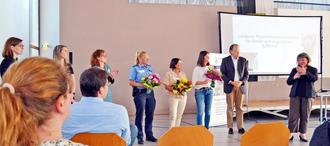 SÜW-Jugendamtsleiterin Hannelore Schlageter (rechts) begrüßte die Teilnehmenden der Netzwerkkonferenz, darunter (von links) die drei Netzwerkkoordinatorinnen Veronique Wenzel, Karoline Distler (beide Stadt Landau) und Martina Fuchs (Kreisverwaltung SÜW), Susanne Lantz vom Polizeipräsidium Rheinpfalz, Anja Ziebler-Kühn vom Kinderschutzbund Landau-SÜW, Andrea Kircher von der Psychotherapeutischen Ambulanz der RPTU in Landau und Erster Kreisbeigeordneter Georg Kern.