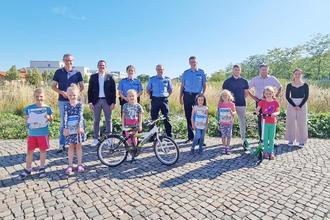 Die erfolgreichsten Teilnehmer:innen der Aktion „Sicherer Schulweg“ wurden jetzt von Bürgermeister und Schuldezernent Dr. Maximilian Ingenthron (hintere Reihe, ganz links), Schulamtsleiter Ralf Müller (hintere Reihe, 2. v. r.), der Polizei und Sponsor:innen geehrt und belohnt.