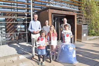 Bürgermeister Dr. Maximilian Ingenthron, Lena Wirzberger vom Team der Stadtbibliothek und die Leiterin der Kinder- und Jugendbibliothek Magdalena Schlosser (hintere Reihe v.l.n.r.) gemeinsam mit den beiden Gewinnerinnen und dem Gewinner der Lesesommer-Hauptpreise.