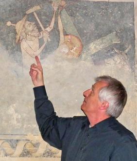Manfred Ullemeyer erläutert die Darstellung eines Juden in der Katharinenkapelle.