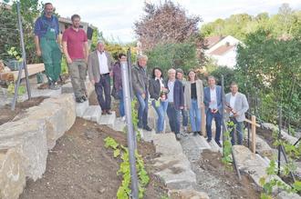 Von Landau für Landau: Beigeordneter Jochen Silbernagel (5.v.r.) und Tourismus-Chefin Nina Ziegler (3.v.r.) gemeinsam mit Matthias Kohlmayer, Bürgermeister von Landau an der Isar (2.v.r.) und weiteren Vertreter:innen der bayerischen Schwesterstadt im frisch gepflanzten Landauer Weinberg.