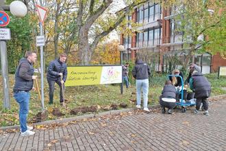 Auszubildende der Kreisverwaltung setzen Blumenzwiebeln vor dem Kreishaus