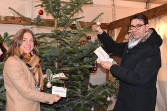Susanne Burgdörfer vom Haus der Familie und OB Thomas Hirsch hängen die Karten mit den Wünschen an den Kinderwunschbaum. -Foto: Stadt Landau