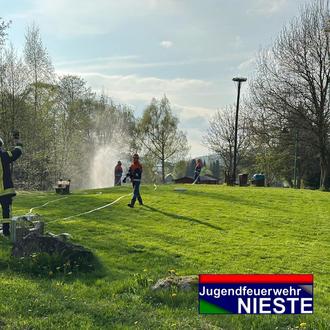 Bei bestem Frühlingswetter konnte die Jugendfeuerwehr mehrere Löschübungen im Bereich der Parkanlage Bleichwiesen durchführen.