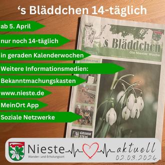 im Rahmen der Haushaltsberatungen und damit verbundenen Kosteneinsparungen, sowie einen weiteren Schritt hin zu digitalisierten Abläufen, haben sich die Gemeindegremien darauf verständigt, dass unser Mitteilungsblatt „`s Bläddchen – Die Niester Woche“ ab 05.04.2024 nur noch 14-tägig erscheint, und zwar immer in den geraden Wochen.