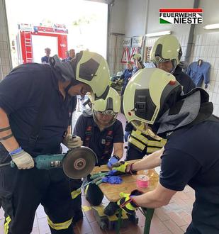 Unser Kamerad Tobias brachte einige praktische Beispiele aus seiner beruflichen Tätigkeit im Einsatz- und Leitstellendienst der Berufsfeuerwehr mit und bereitete dazu 6 Stationen “Technische Hilfeleistung klein” vor. In 2 Gruppen galt es mit den Materialien und Werkzeugen des LF10 patientenorientierte, teils kreative Rettungsmöglichkeiten aus den verschiedenen Zwangslagen zu finden und verschiedene Methoden auszutesten. Es galt einen Arm aus einem Drahtgeflecht zu befreien, Handschellen mit abgebrochenem Schlüssel zu lösen, eine Ring und eine Mutter von angeschwollenen Fingern zu entfernen, den angenagelten Fuß eines Bauarbeiters von einem Balken zu lösen, ein Kind aus einem Rohr sowie eine Hand aus einem Kabelkanal zu befreien.