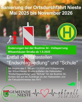 Am 1.9.2026 starten die Bauarbeiten des 2. Bauabschnittes der L3237 OD Nieste - Witzenhäuser Straße. Gebaut wird unter Vollsperrung bis voraussichtlich Ende April 2026. Daher können in dieser Zeit die Bushaltestellen der Linie 34 "Endschlagsiedlung" und "Schule" nicht bedient werden.