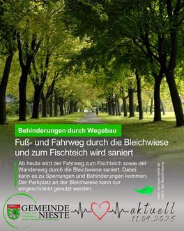 Seit dem 11.09.2025 wird der Fahrweg zum Fischteich, sowie der Wanderweg entlang der Nieste und durch die Bleichwiesen durch die Firma Hartmann aus Immenhausen saniert. Die Arbeiten werden innerhalb der nächsten beiden Wochen abgeschlossen sein, wenn das Wetter mitspielt. Während der Bauzeit kommt es zu Behinderungen und Sperrungen der Wege.