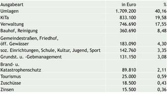 Die gesamten Zuweisungen und Steuereinnahmen belaufen sich auf 3.451.900 €. Zieht man davon Kreisumlage, Schulumlage, Heimatumlage, Gewerbesteuerumlage und die Personalkosten ab, verbleiben gerade mal 27.470 € aus den Steuermitteln und Zuweisungen übrig, mit denen alle anderen Aufgaben finanziert werden müssen.