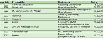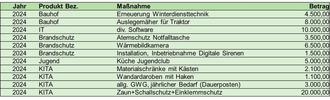 Rund 232.500 € verbleiben aus dem Jahr 2022 und 2023. Im Wesentlichen für Straßenerneuerung, Hochwasserschutz und die LED-Straßenbeleuchtung, sowie die Tore für den Friedhof.