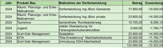 Bei den ersten beiden Summen handelt es sich zum einen um die Beauftragung eines Planungsbüros, das uns in der Dorfentwicklung begleitet, zum anderen um ein weiteres Planungsbüro, dass die privaten Aktivitäten unterstützen soll und die Bürgerinnen und Bürger bei der Umsetzung berät.