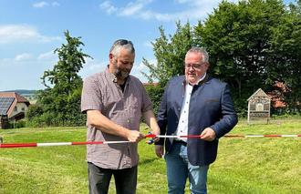 Oliver Pick (Vorsitzender der Gemeindevertretung) und Bürgermeister Klaus Missing durchschneiden symbolisch das Band zur Einweihung