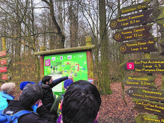 Teilnehmer/innen der HWGHV-Wanderführenden-Grundausbildung im Februar 2024, an einer Wandertafel des Geo-Naturparks Frau-Holle-Land
