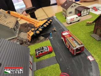 Am Nachmittag folgte auf eine Unterrichtseinheit zur Kartenkunde eine Funk- und Koordinatenübung, bei der es auf Basis übermittelter Koordinaten verschiedene Standorte im östlichen Landkreis auf der Landkarte zu ermitteln und anzufahren galt. So wurde das Thema Kartenkunde praktisch gefestigt, gleichzeitig das Funken geübt, die Ortskenntnis verbessert und die Handhabung der Fahrzeuge geübt. An den jeweiligen Zielpunkten galt es dann verschiedene Aufgaben zu erfüllen.
