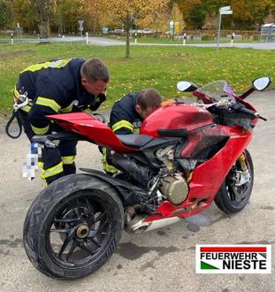Am Samstagvormittag des 25.10.25 wurde die Feuerwehr Nieste zu einem brennenden Motorrad im Kreuzungsbereich der Kreisstraßen 4 und 6 gegenüber dem Parkplatz der Königsalm alarmiert.