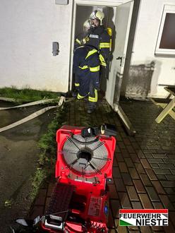 Um eine bessere Sicht zu gewährleisten und somit die Personenrettung zu beschleunigen, wurde der kürzlich neu beschaffte, elektrisch betriebene Akku-Lüfter in den Einsatz gebracht, der den in die Jahre gekommenen Lüfter mit Benzinmotor ablöste.
