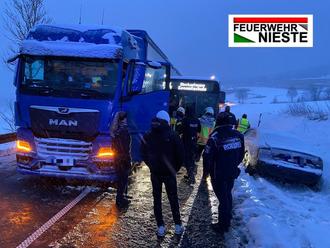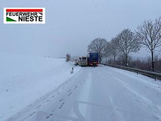 Aufgrund von Glätte, bedingt durch den ununterbrochenen Schneefall, war an der Einsatzstelle ein Bus bei dem Versuch an einem bereits an der Steigung stehenden, manövrierunfähigen LKW vorbeizufahren seitlich in diesen hineingerutscht. Zusätzlich musste ein aus der Gegenrichtung kommender PKW den beiden Großfahrzeugen ausweichen und rutsche dabei in den Straßengraben. Somit war die Kreisstraße durch drei verunfallte Fahrzeuge vollständig blockiert und nicht mehr passierbar.